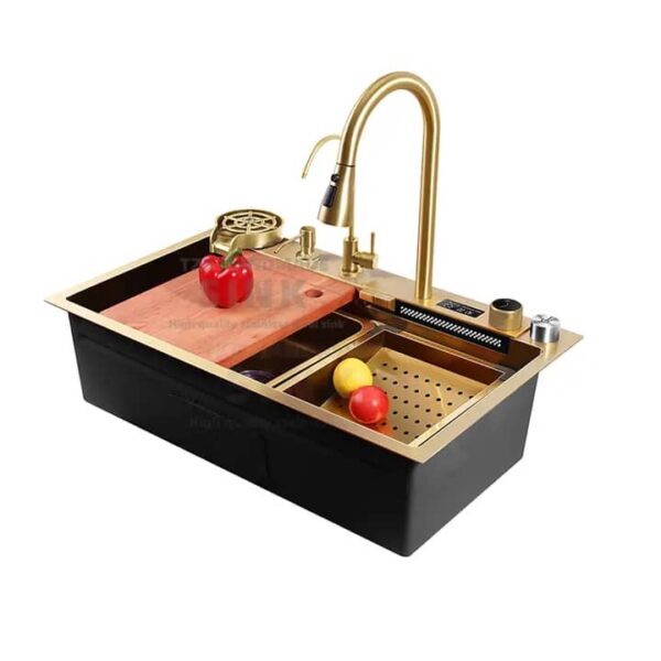 Redefine your kitchen experience with the Golden Nano-Coated Full-Option Luxury Kitchen Sink. Engineered for style and functionality, this premium sink features an exquisite golden finish and advanced features, making it the ultimate choice for modern kitchens.